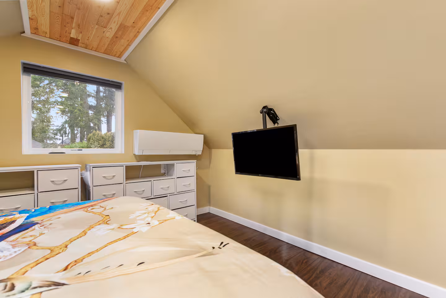 The bedroom upstairs is airy from all the skylights, open floor plan, an adjustable queen bed, and a transforming day bed that can be a king, 2 twins, or a single. It also has an HDTV and leather chair to melt into comfort.