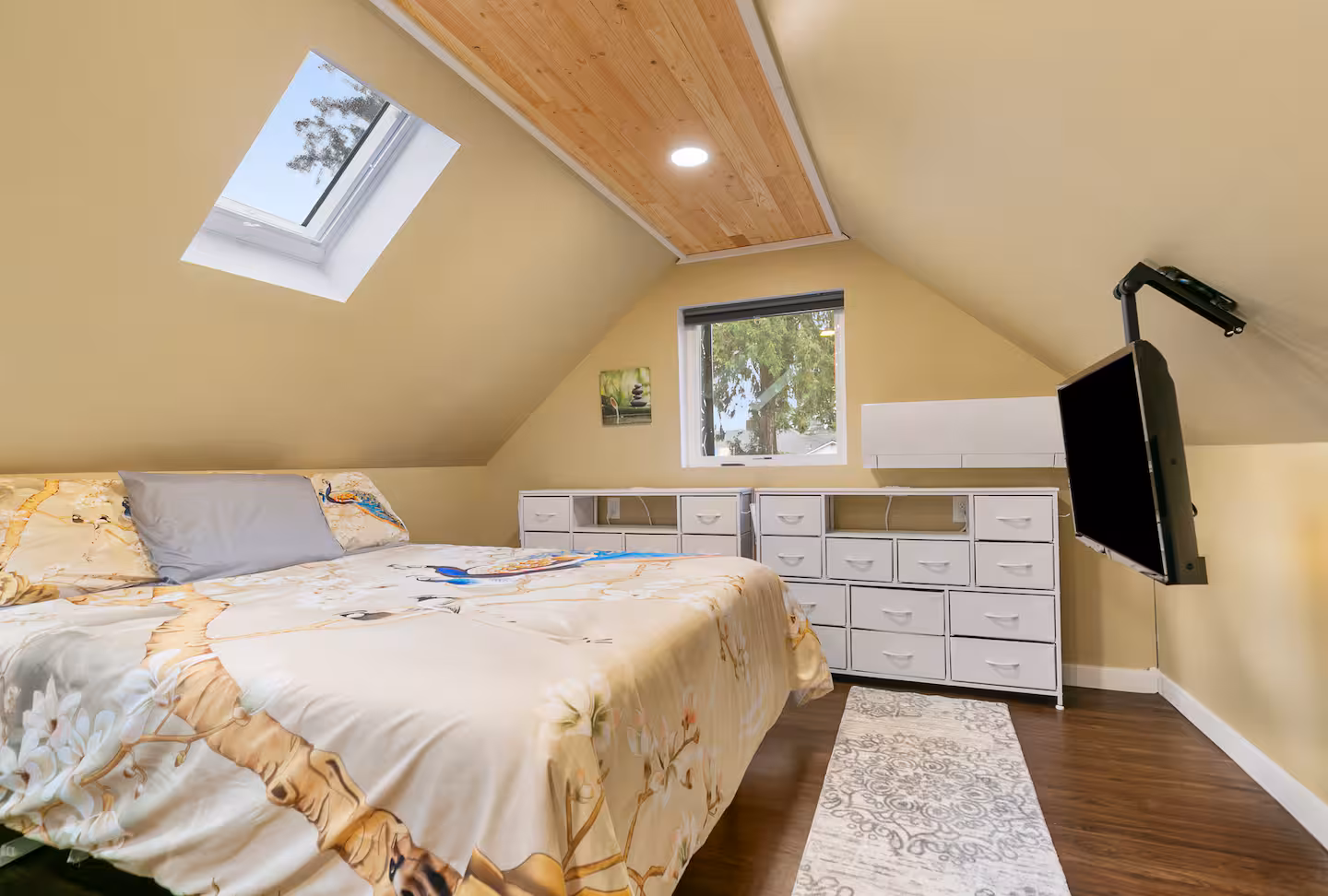 The Garage Mahal is a Mid Term Monthly lofted Garage conversion rental. It is all new and available for you use and savor the tranquil environment and utility of its design. It has comfort in mind with excellent insulation, new windows, and AC. Now you get to book Portland’s Plushest Private airbnb in a quiet neighborhood with gorgeous sunsets.