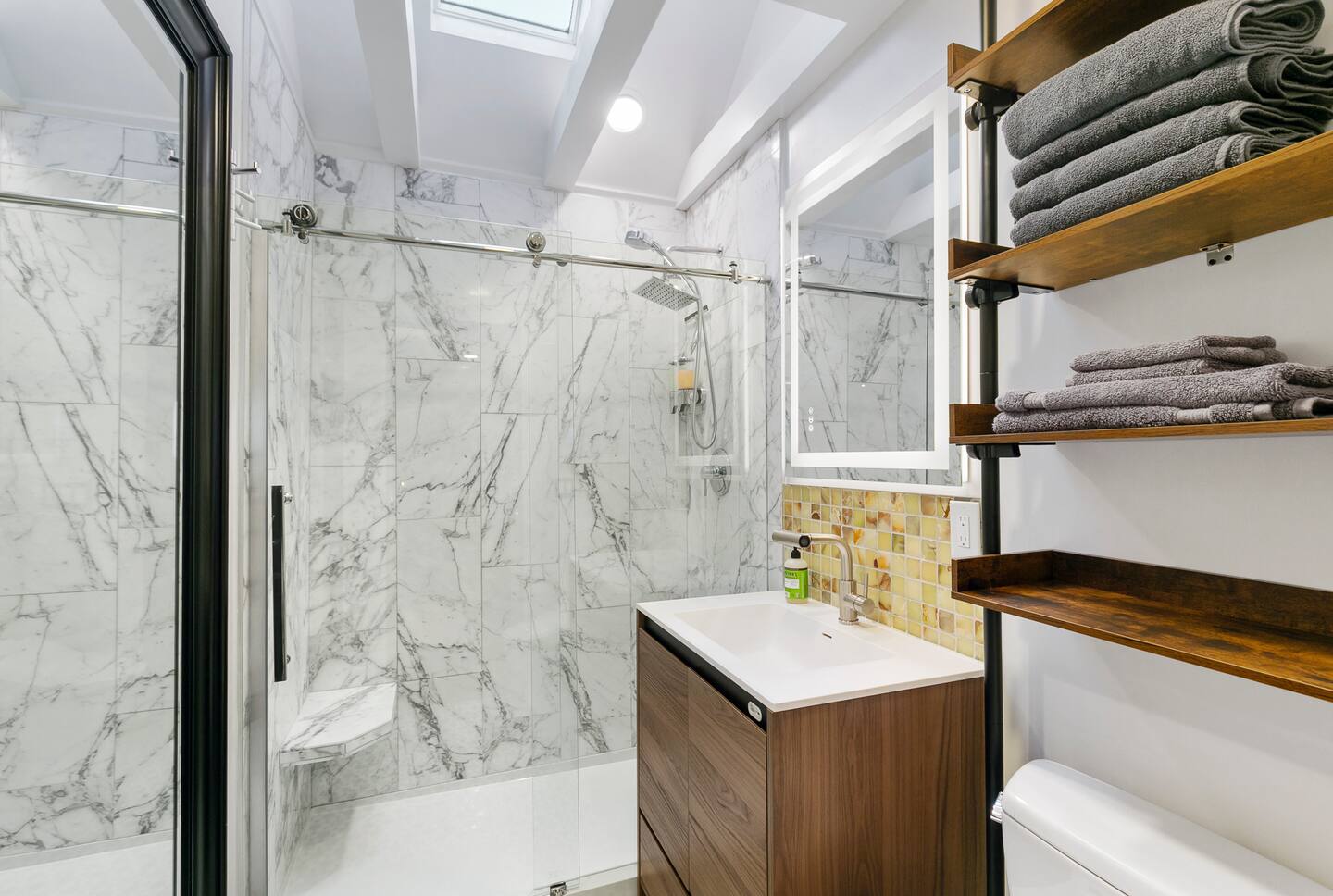 The bathroom is designed to take your breath away. Skylights, Italian marble, radiant heated flooring, toto elongated toilet with bidet, Grohe shower and rain head.